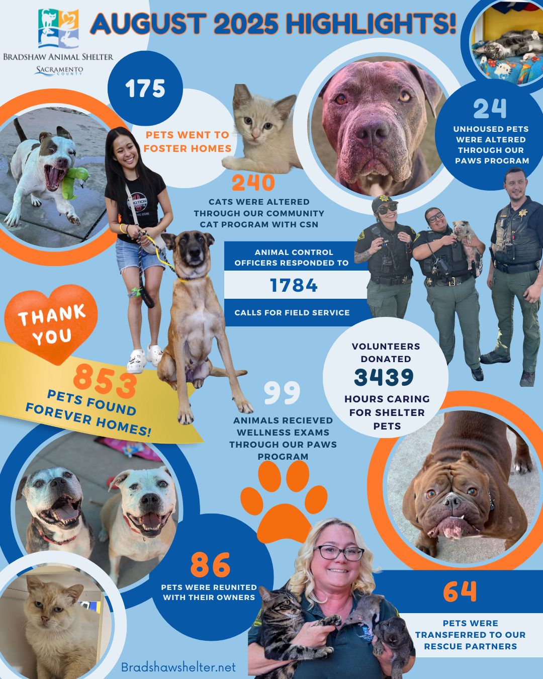 Please note that these numbers are accurate on the date they are pulled and released. However, certain factors like an adoption return can alter the numbers in the future. If you have any questions about our statistics, please contact us at countyanimalcare@saccounty.net.