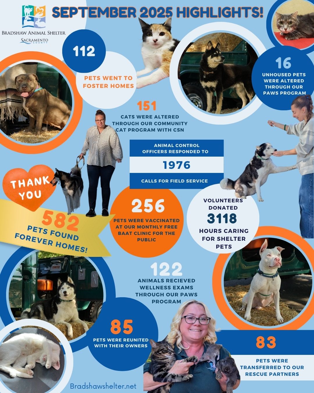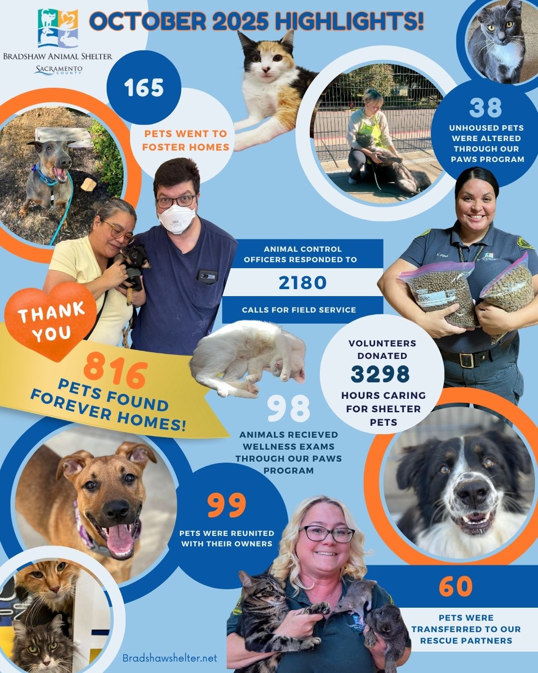 Please note that these numbers are accurate on the date they are pulled and released. However, certain factors like an adoption return can alter the numbers in the future. If you have any questions about our statistics, please contact us at countyanimalcare@saccounty.gov.
